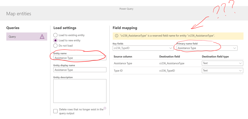 Testing 1 . Trying to load data to a new entity … It doesn’t like that entity name is the same as a primary field name, apparently.