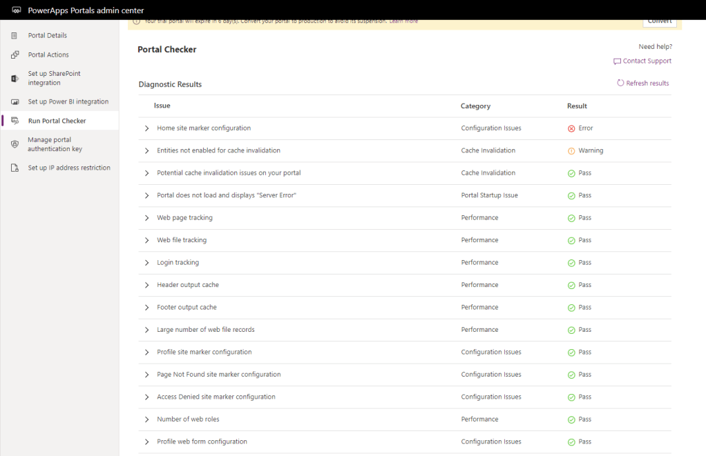 After it run all the checks it displays you the report. You could easily see some issues if any. Well done for Pass but look closely for Warnings and Errors. This is a very helpful article describing each item in the report and how to fix if there is a problem in details: https://docs.microsoft.com/en-au/powerapps/maker/portals/faq