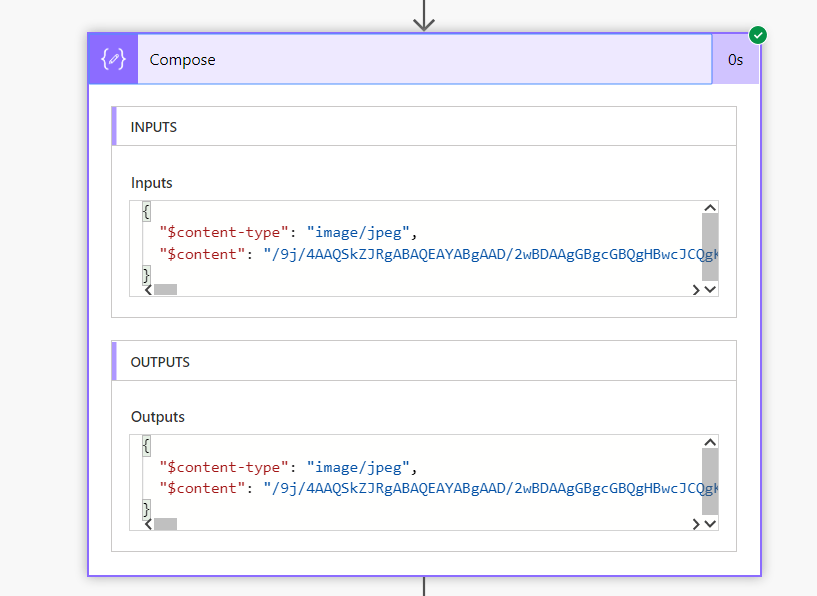 This action retrieves the original image (if you choose to store one) from Azure BLOB. Then you need to apply base64(…) function and compose the JSON as per screenshot below: