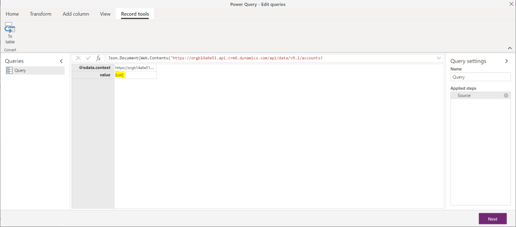 Json.Document(Web.Contents("https://orgxxxx.api.crm6.dynamics.com/api/data/v9.1/accounts?$filter=name%20eq%20%27Imperial%20Enterprise%27"))