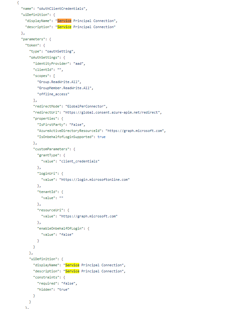 Let’s modify the apiProperties.json file to include a new section (search in the file for “Service Principal” to find the section on the screenshot below: